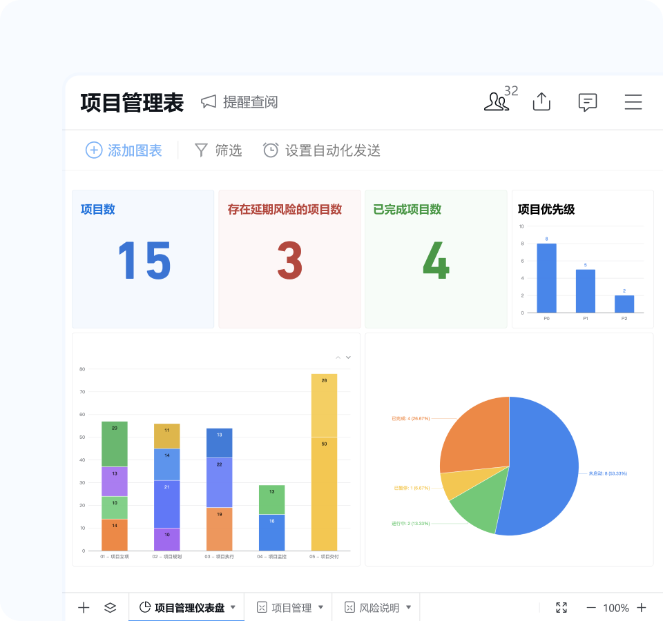 以产品研发为例,传统项目管理依赖人工汇总进度,跨部门协作效率低且易出错;而智能表格让成员直接输入任务进展,项目负责人即可通过「仪表盘」多视图(如甘特图、看板)实时监测各环节进度,逾期任务自动标红并触发预警流程,例如进度滞后时自动拉群提醒责任人。