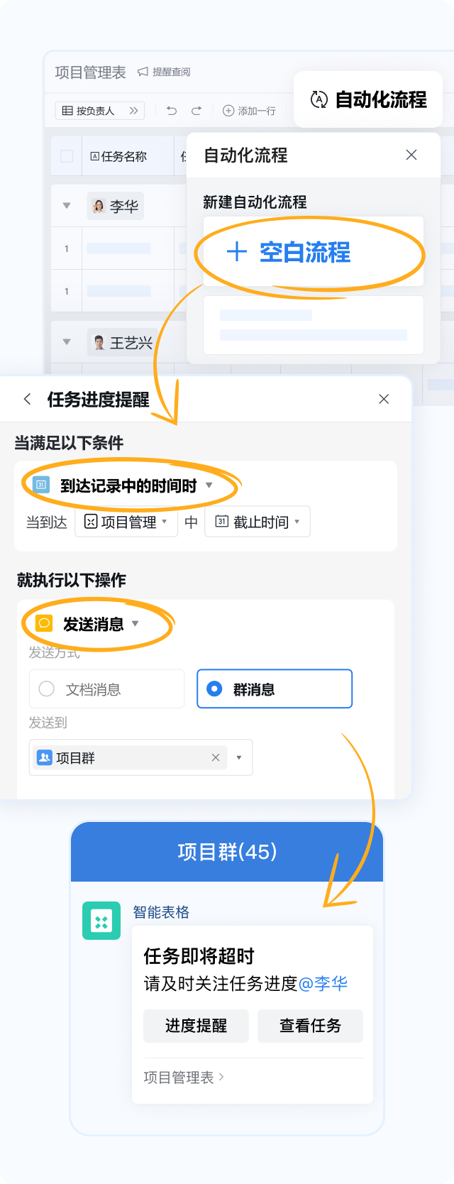 设置触发条件(如销售进度滞后),自动发送消息提醒或拉群跟进,减少人工干预。