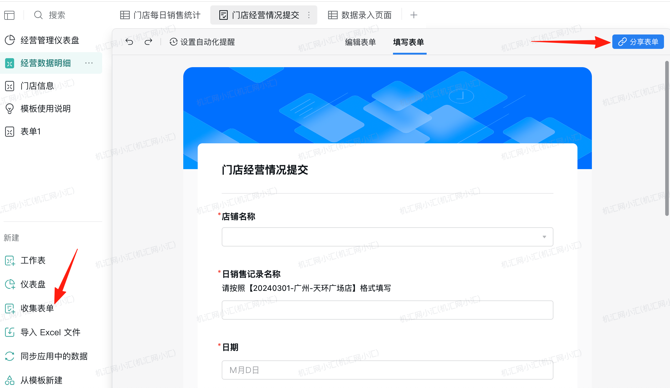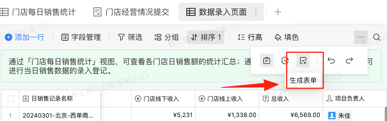 在智能表格数据录入页面的右上角,直接点击「生成表单」,自动生成对应表单。