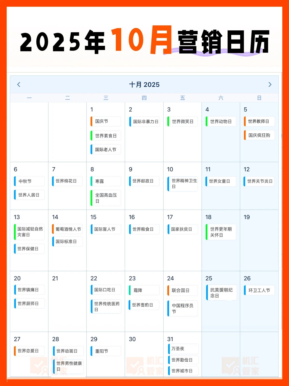 10月营销主线:国庆→中秋→重阳,贯穿“家国情怀+团圆敬老”情感线。月底可结合万圣节节点适合年轻化、趣味化营销,与国庆严肃主题形成互补。行业可交叉,如食品行业可覆盖中秋、重阳、万圣等多个节点。