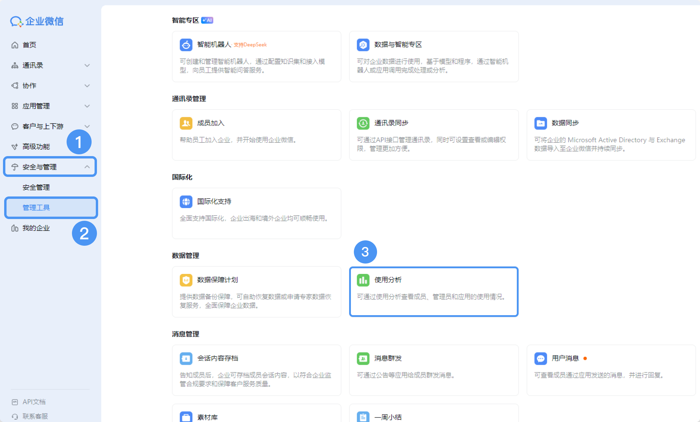 01 如何查看成员操作记录 企业微信超级管理员登录【管理后台】>进入【安全与管理】>选择【管理工具】>点击【使用分析】>即可进入【成员操作记录】页面。