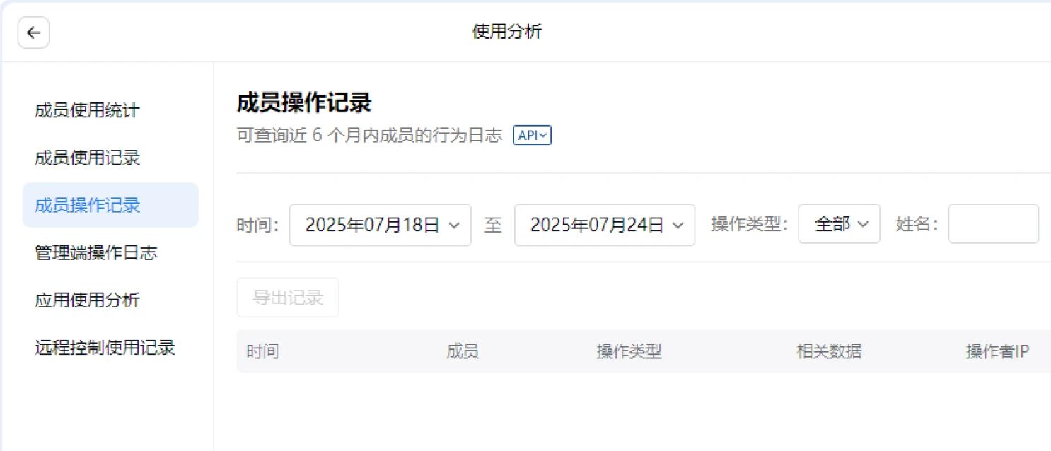导出功能:支持将筛选后的记录导出为Excel文件,便于存档和深度分析。 导出限制:单次导出的记录条数上限为21万条。如果数据量过大,系统会提示,此时需缩小查询范围(如缩短时间范围)进行分批操作。 精准导出:查询到的记录时间精确到秒,为问题排查提供精准的依据。 API支持:除后台手动导出外,该功能还支持通过API接口导出,方便企业将此数据对接至自身的审计系统或数据分析平台,实现自动化流程。