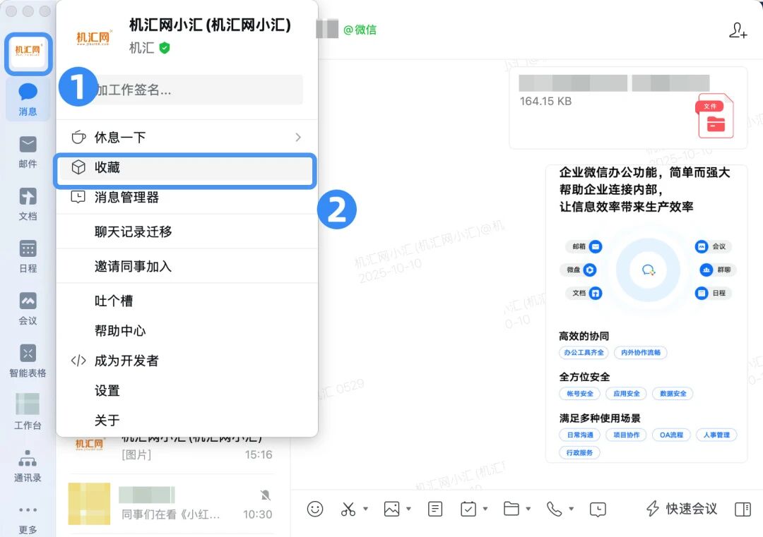 在日常工作中,我们总会遇到需要保存的重要消息、文件或聊天记录,「收藏功能」便捷地帮大家收纳有价值的信息。