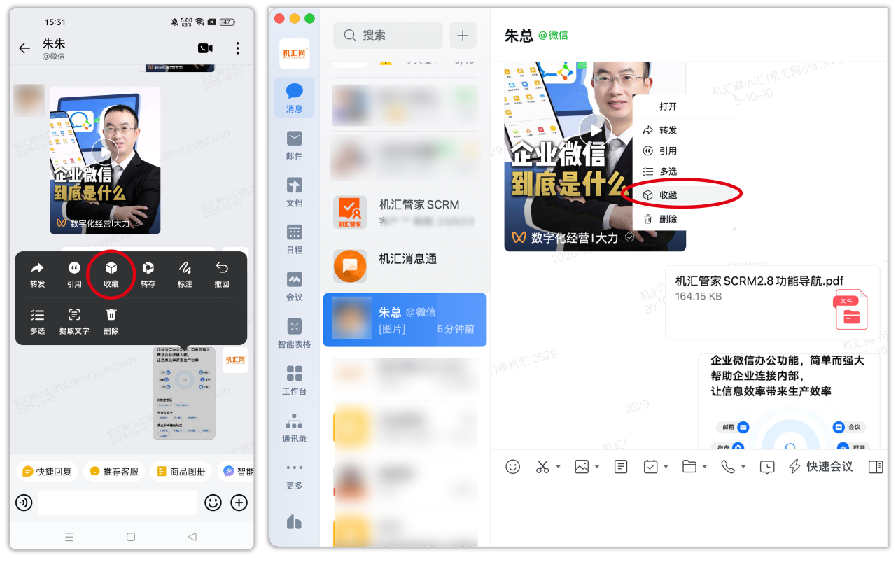 1、手机端与电脑端收藏方式 手机端长按需要收藏的消息操作收藏,电脑端则是鼠标右键点击。