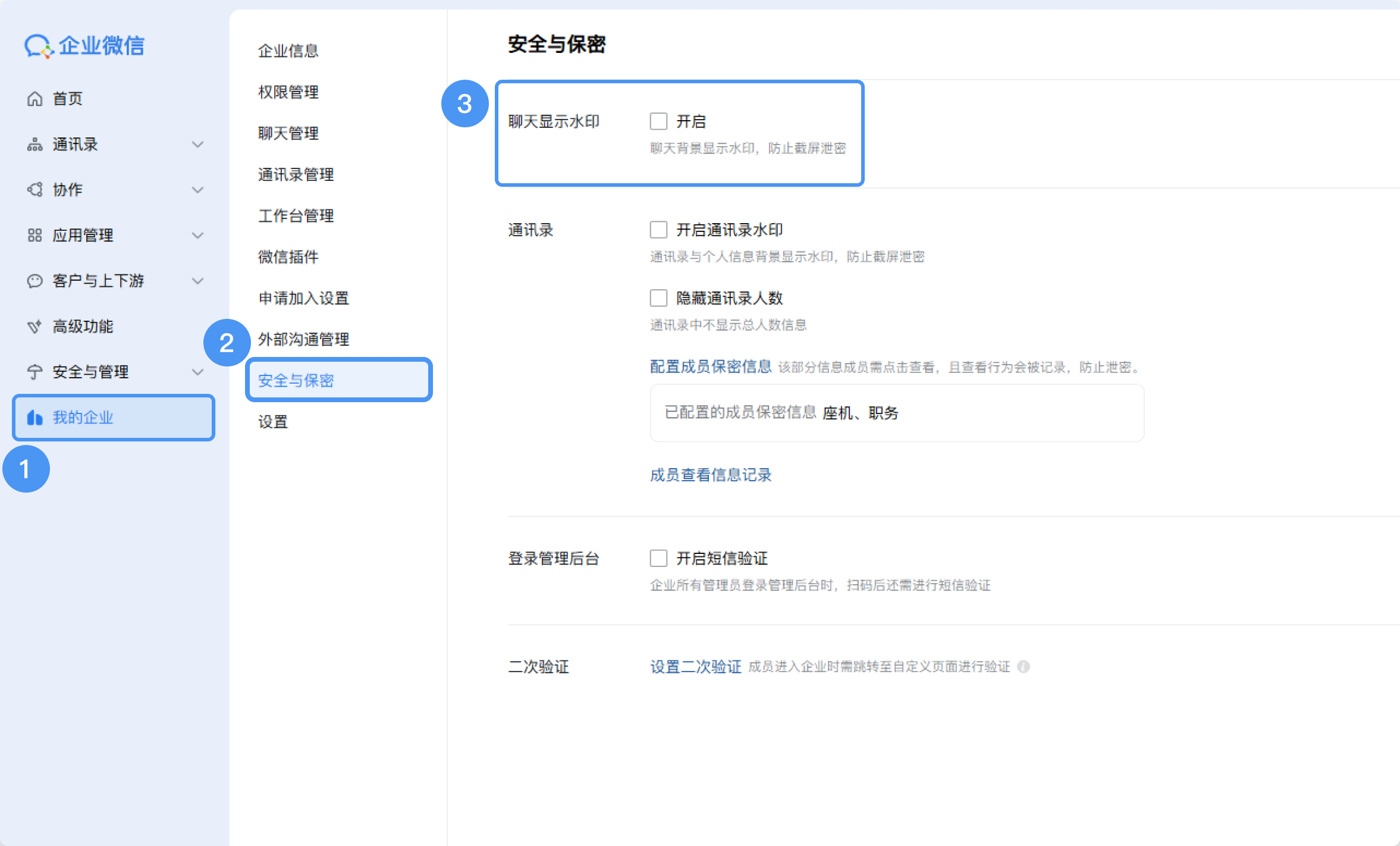 一、如何开启/关闭聊天显示水印 开启聊天显示水印后,聊天背景将会显示成员信息,防止截屏泄密。可以在【管理后台->我的企业->安全与保密】内聊天显示水印勾选开启,取消勾选则为关闭。