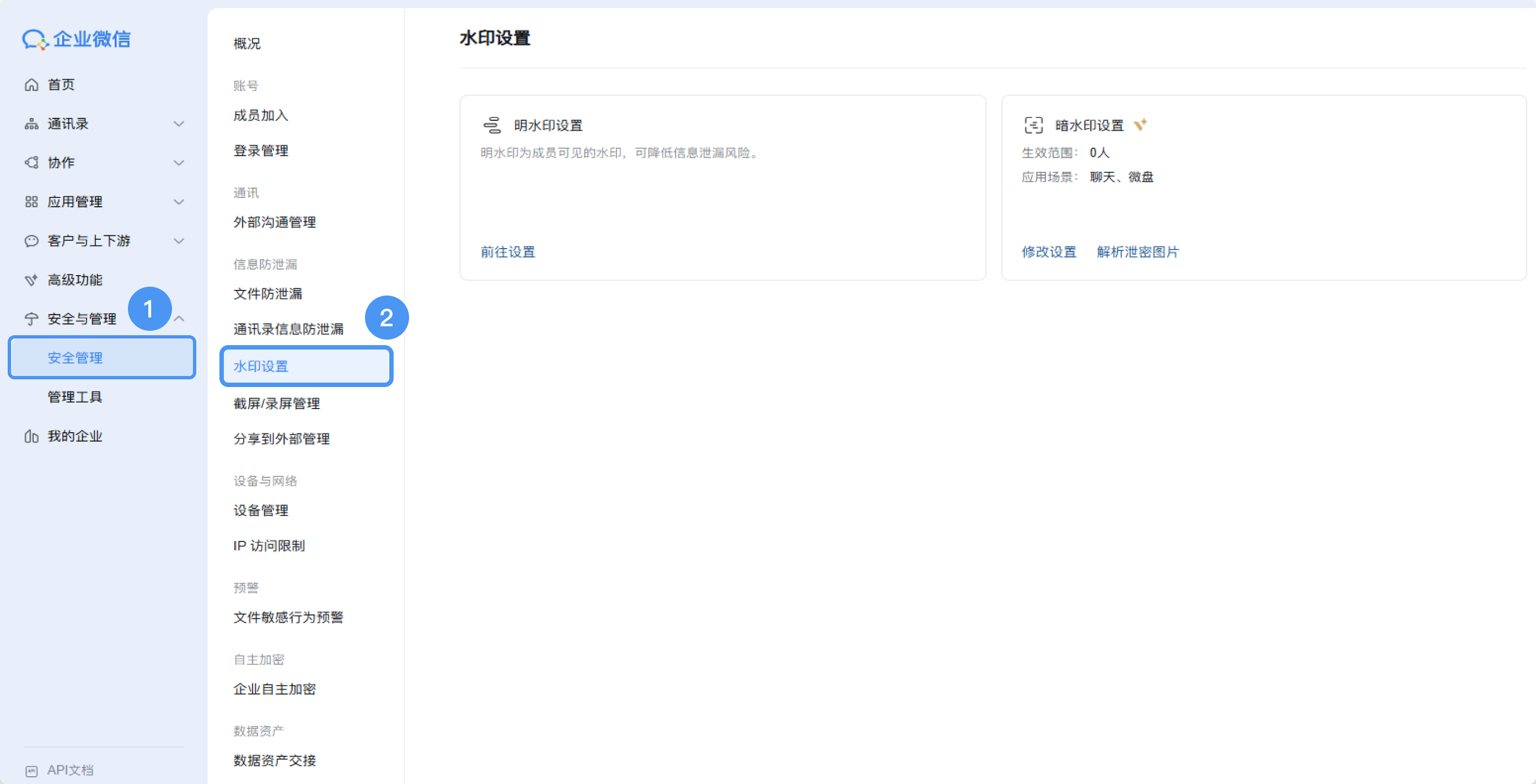 可以在【管理后台->安全与管理->安全管理->水印设置】设置水印显示信息,如姓名、手机号后四位、账号、时间戳;以及水印样式,如颜色深浅、水印疏密。